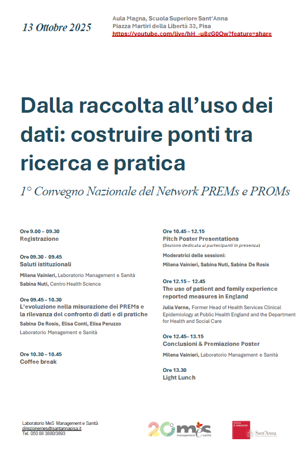 Il Laboratorio MeS della Scuola Superiore Sant’Anna organizza a Pisa il Primo Convegno Annuale del Network PREMs e PROMs nell’ambito delle Indagini sull’esperienza e gli outcome riportati dai pazienti, condotte in collaborazione con le aziende sanitarie e regioni italiane.